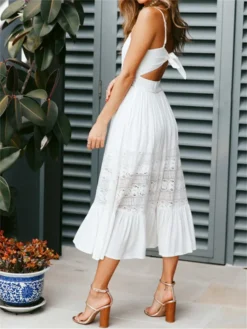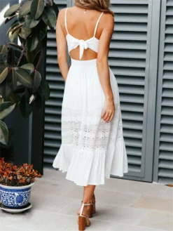 Women Sexy Dress, Sling Solid Color Deep V-Neck Floral Lace Back Straps Tie Dress, Summer Cutouts Ruffle Hem Backless Dress